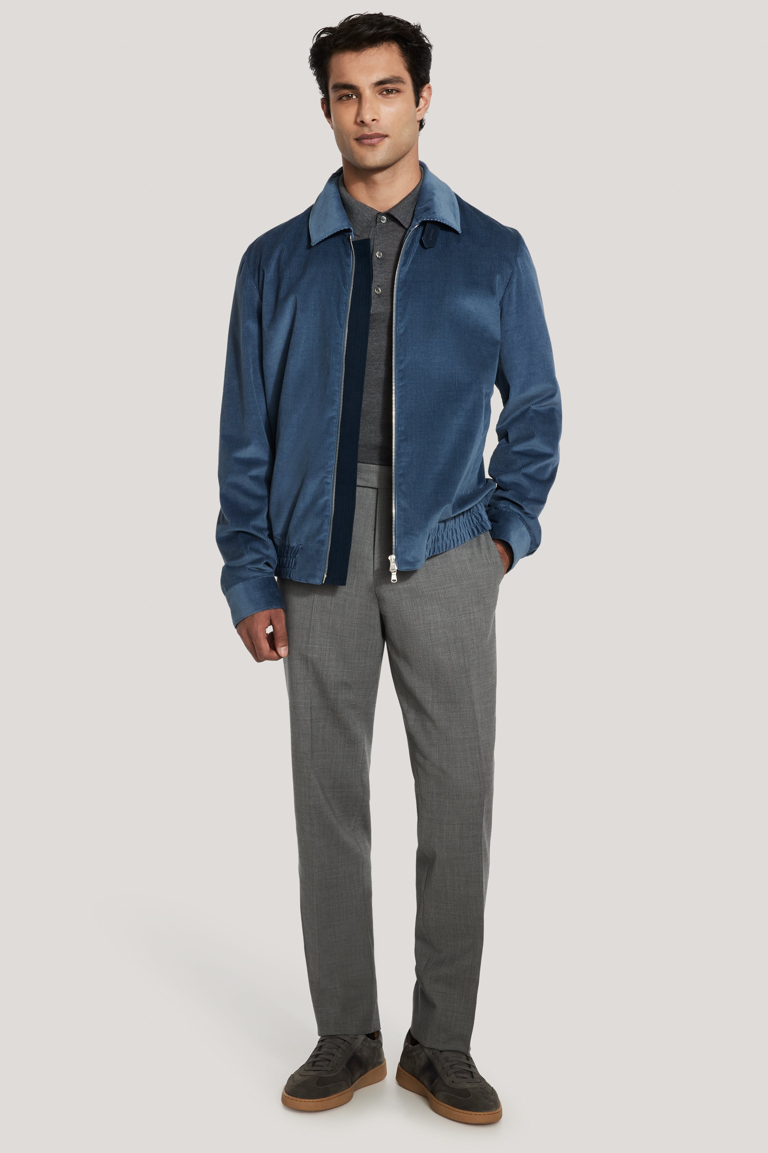 La veste bomber Billy allie style et fonctionnalité avec son col rabattu, son dessous de col en moleskine contrastante et sa patte d'extension. Confectionnée en velours côtelé fin de coton et cachemire italien dans un coloris Bleu Vintage unique, elle est dotée d'une taille élastiquée, de poches intérieures passepoilées et d'une fermeture éclair frontale à double sens pour plus de praticité et de polyvalence. Un équilibre parfait entre raffinement et robustesse.