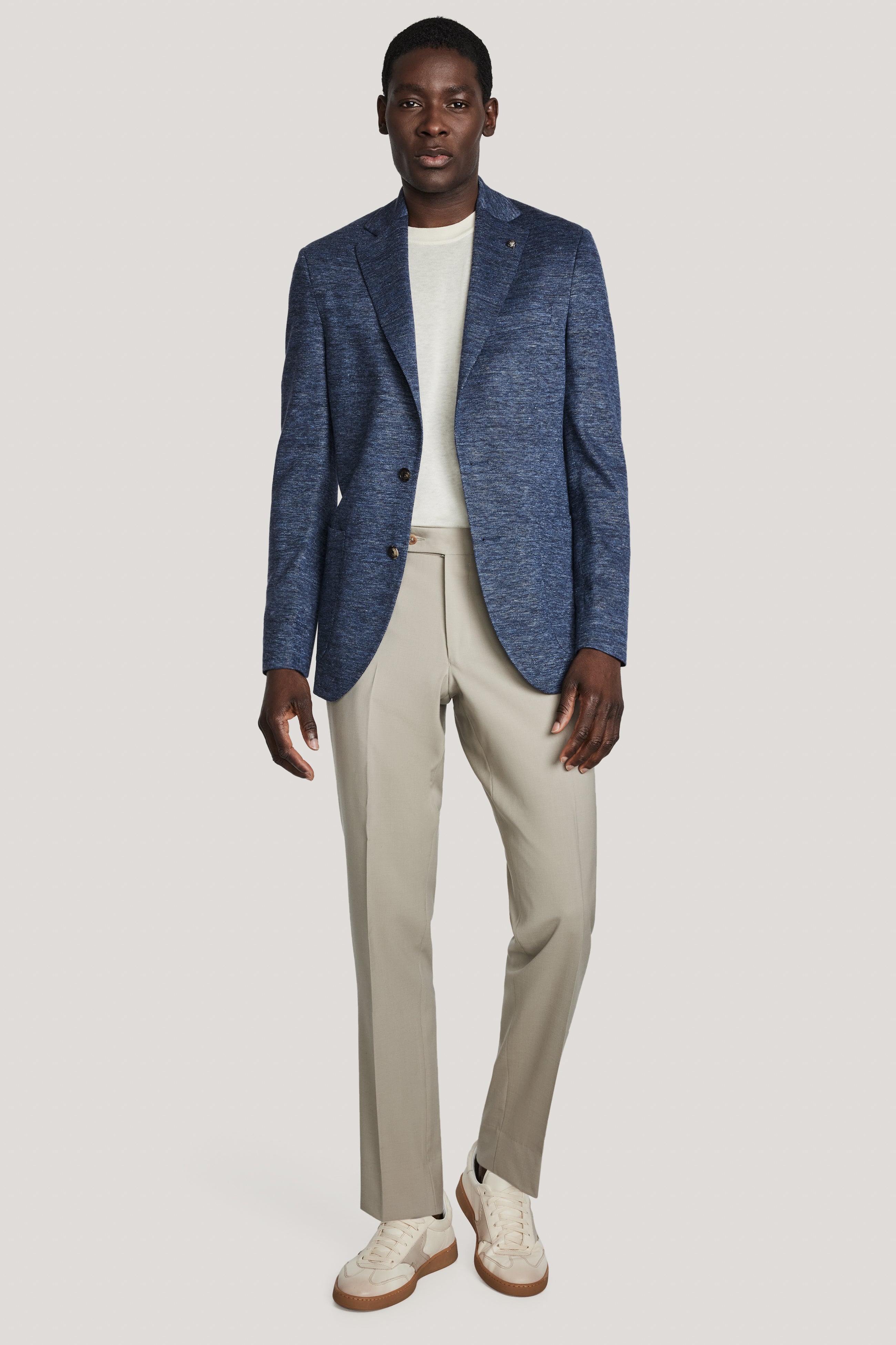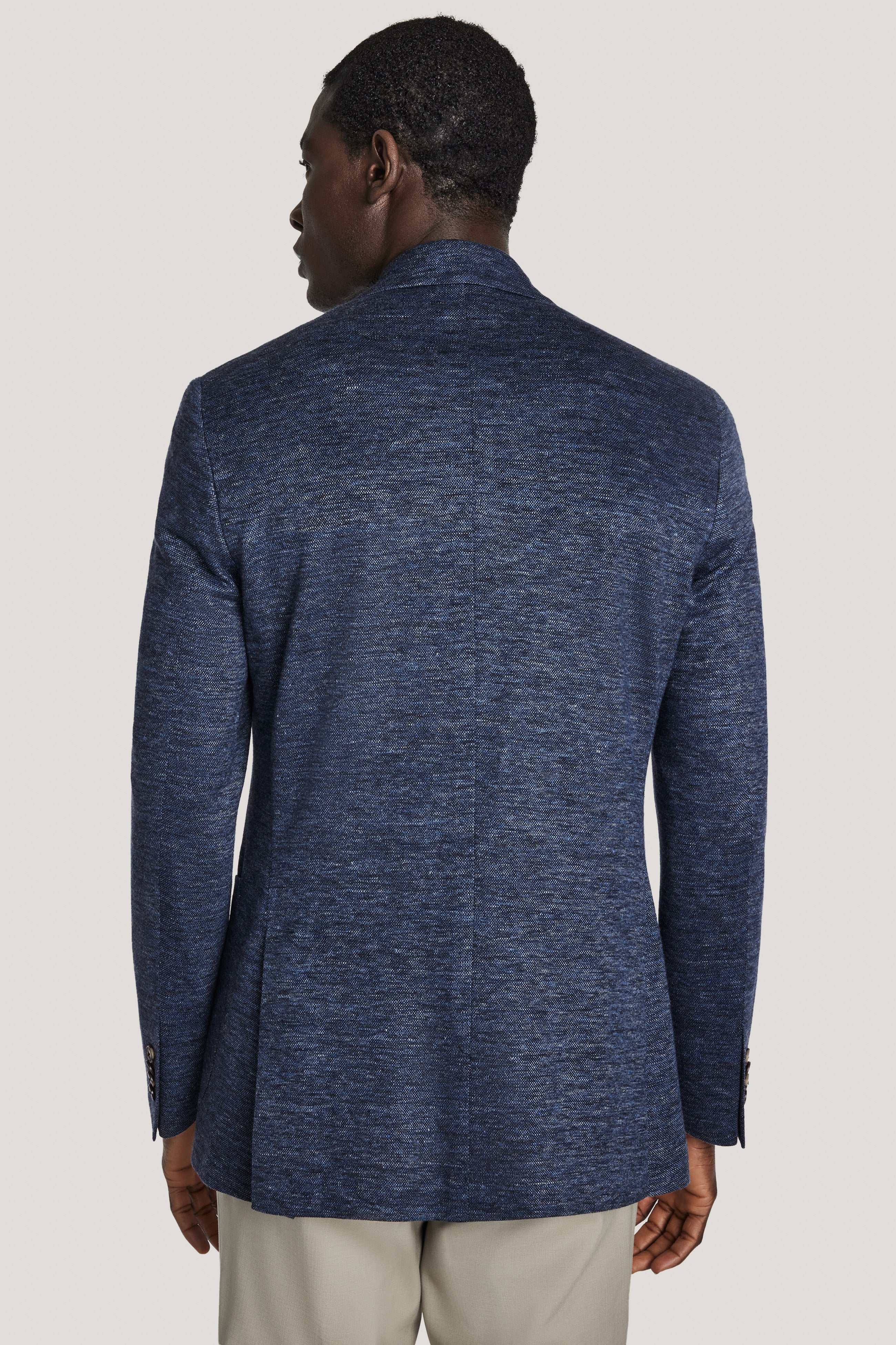 The Hartford jersey COMFORTWEAR™ blazer is expertly crafted from a luxurious blend of linen, wool, and silk, featuring a denim blue mélange design. The wrinkle-free fabric, woven in Italy by the Loro Piana fabric division, enhances its refined appeal. This unconstructed, ultra-soft blazer boasts a contemporary fit and a lightweight butterfly lining, combining comfort with effortless sophistication.