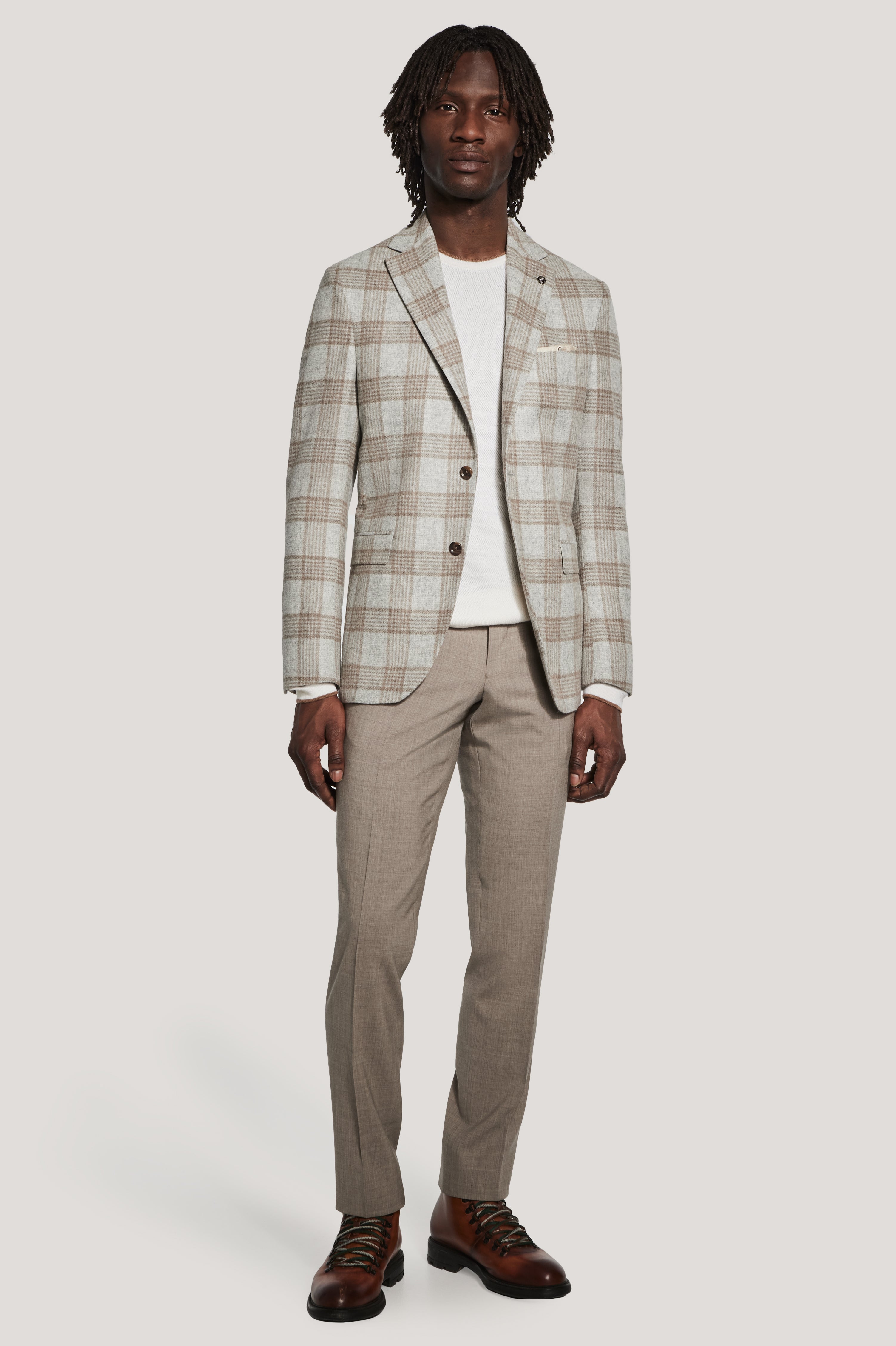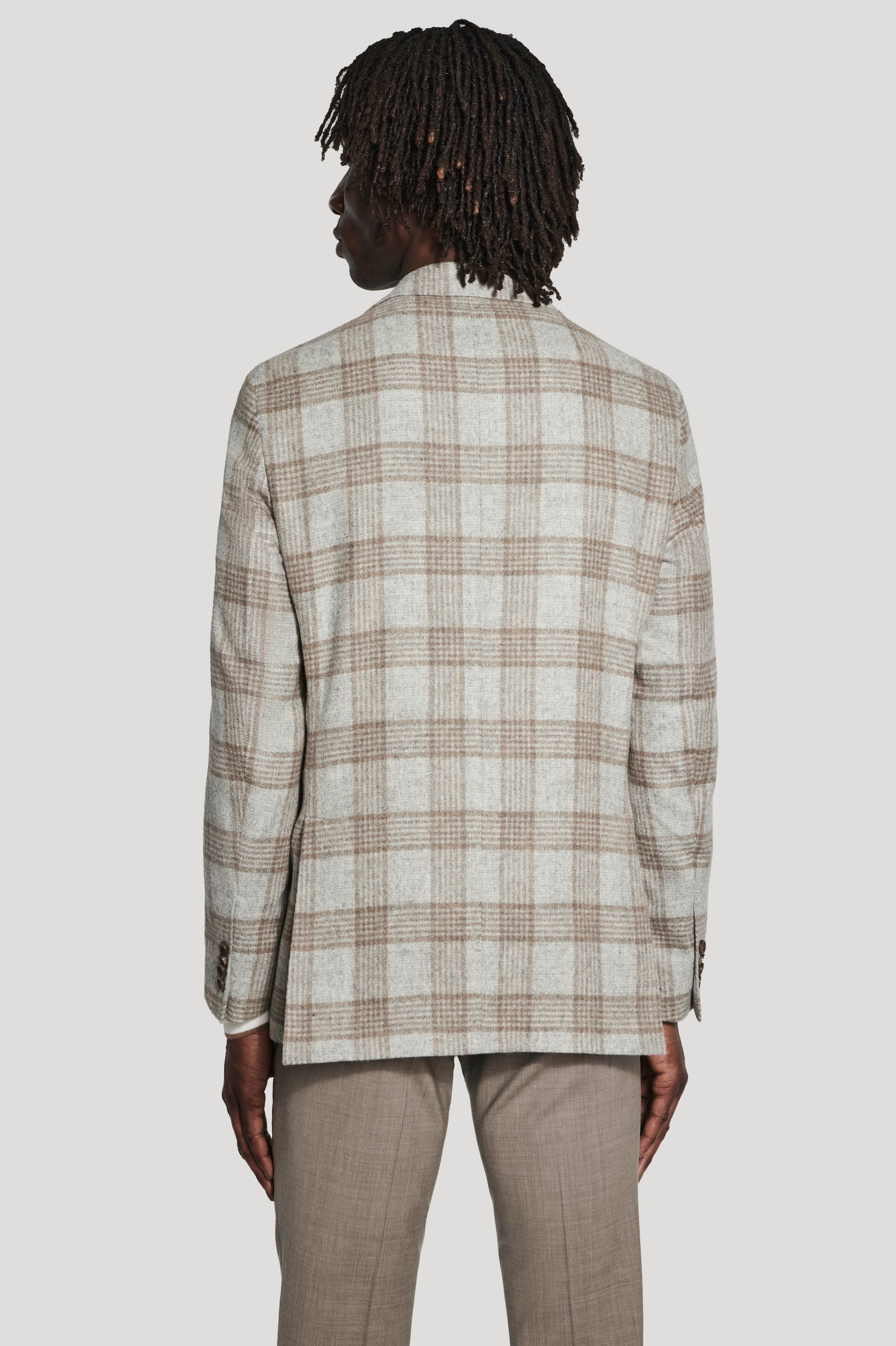 Confectionné dans un mélange d'alpaga et de laine McAllen de première qualité, ce blazer droit à deux boutons arbore un gris clair raffiné à carreaux camel, offrant une texture foulée pour un look riche et imposant. Conçu pour un style luxueux et sophistiqué, il est la pièce idéale à superposer avec des vêtements de sport haut de gamme. Sa construction souple et déstructurée offre un drapé décontracté et élégant, tandis que l'intérieur semi-doublé assure respirabilité et confort. Soigneusement fini avec un revers cranté, des poches à rabat inférieures, une poche poitrine passepoilée supérieure, des poches intérieures, des manches insérées et de fines surpiqûres, ce blazer allie savoir-faire intemporel et polyvalence moderne.