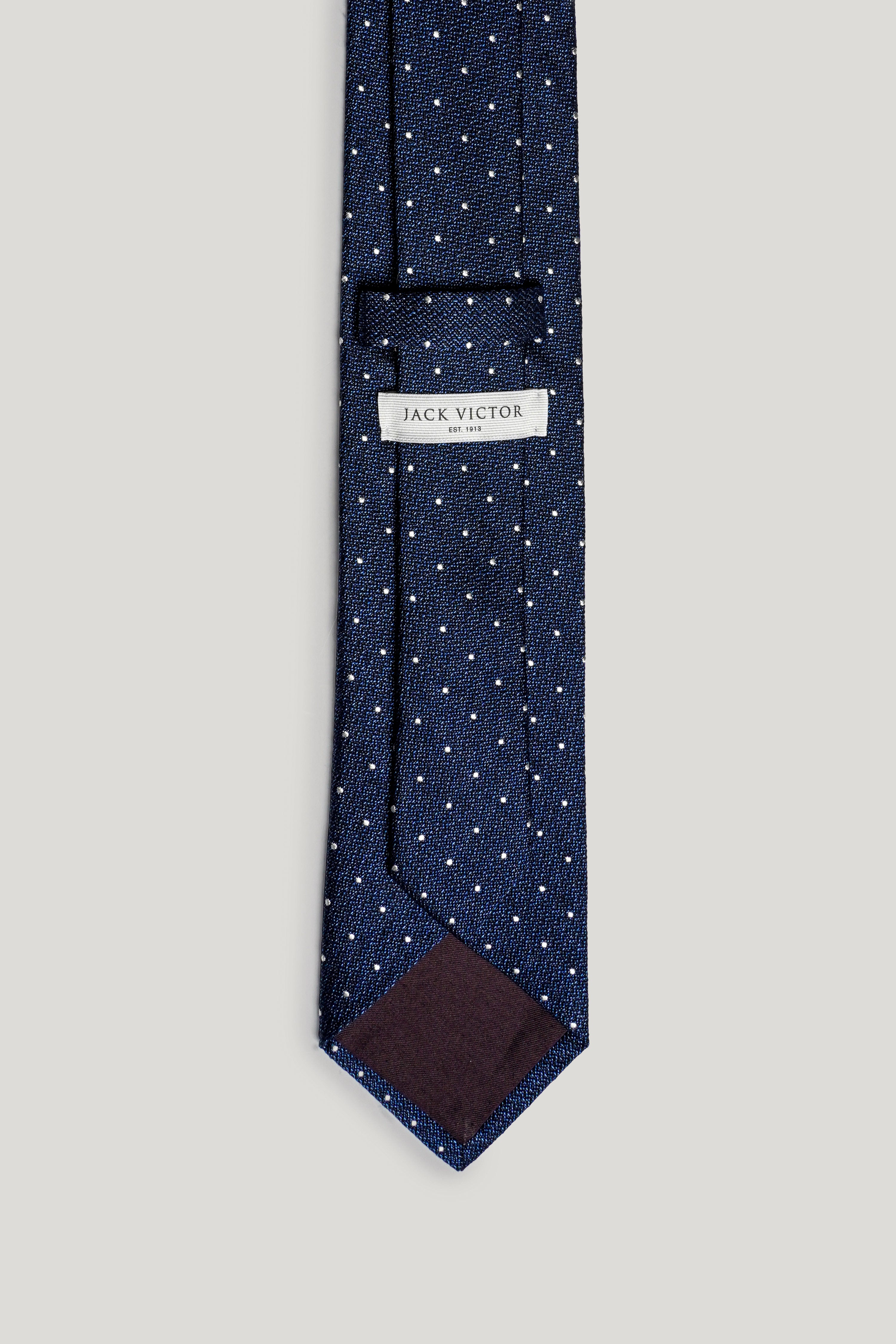 La cravate Pindot présente un motif à pois et est tissée à Eboli, en Italie, à partir d'un mélange luxueux de coton, de laine et de soie. Le motif subtil à pois rehausse n'importe quelle tenue et s'associe parfaitement à votre blazer, smoking ou veste de dîner préférés. La cravate est dotée d'un passant en tissu et de nœuds en lingots finis à la main. Le tissu de finition est le bordeaux emblématique de Jack Victor.