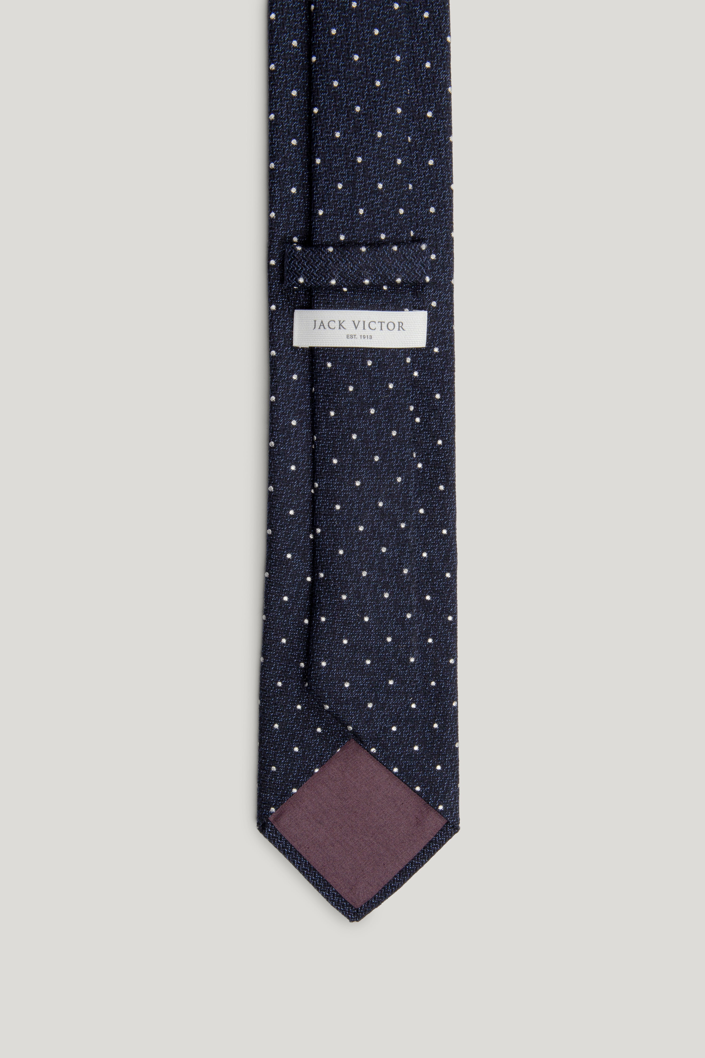 La cravate Pindot présente un motif à pois discrets et est tissée à Eboli, en Italie, à partir d'un luxueux mélange de coton, de laine et de soie. Le motif subtil à pois élève n'importe quelle tenue et se marie parfaitement avec votre blazer, votre smoking ou votre veste de soirée préférés. La cravate est dotée d'une attache en tissu assorti et de nœuds bullion finis à la main. Le tissu de la doublure est le rouge bordeaux signature de Jack Victor.