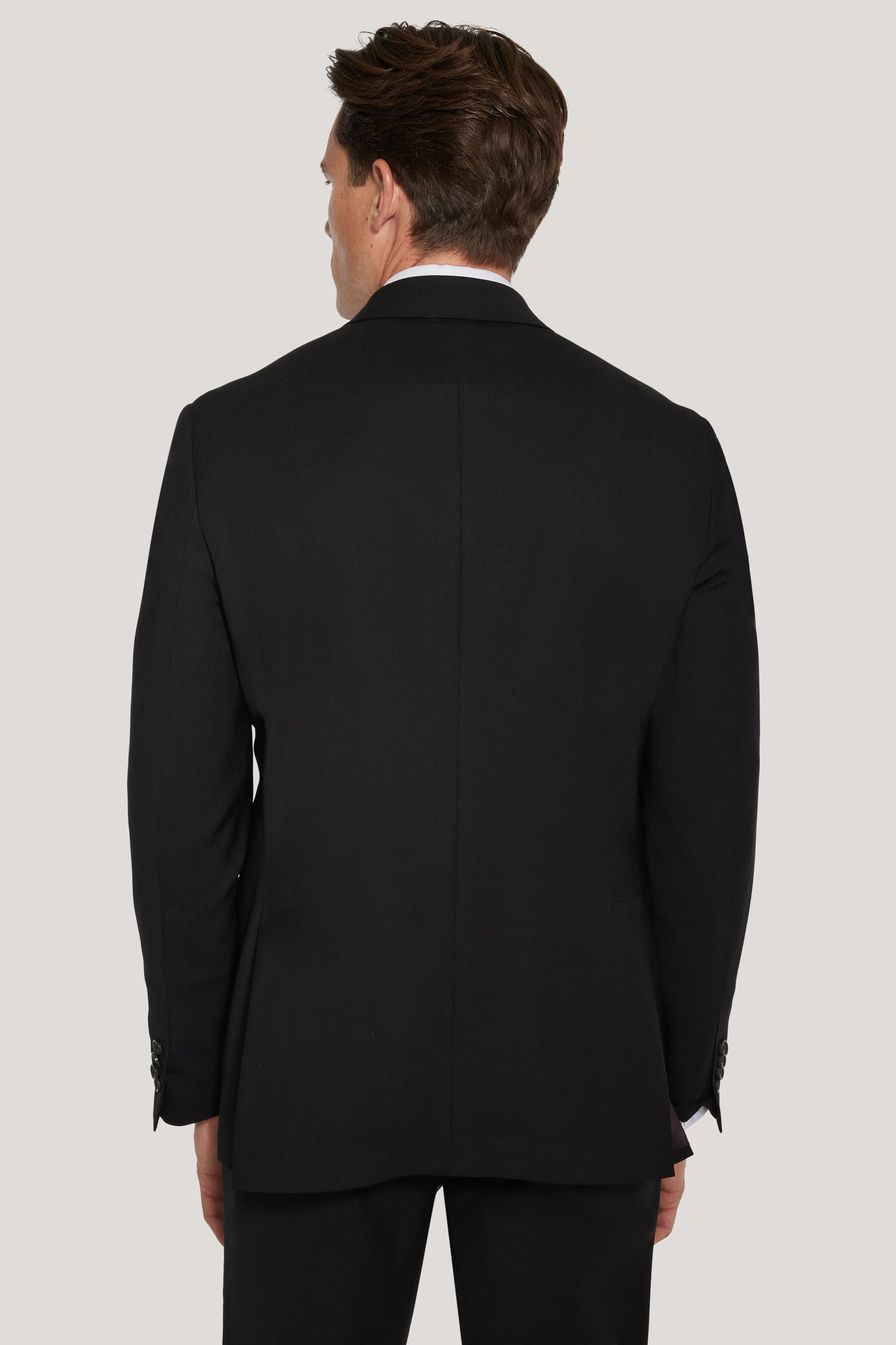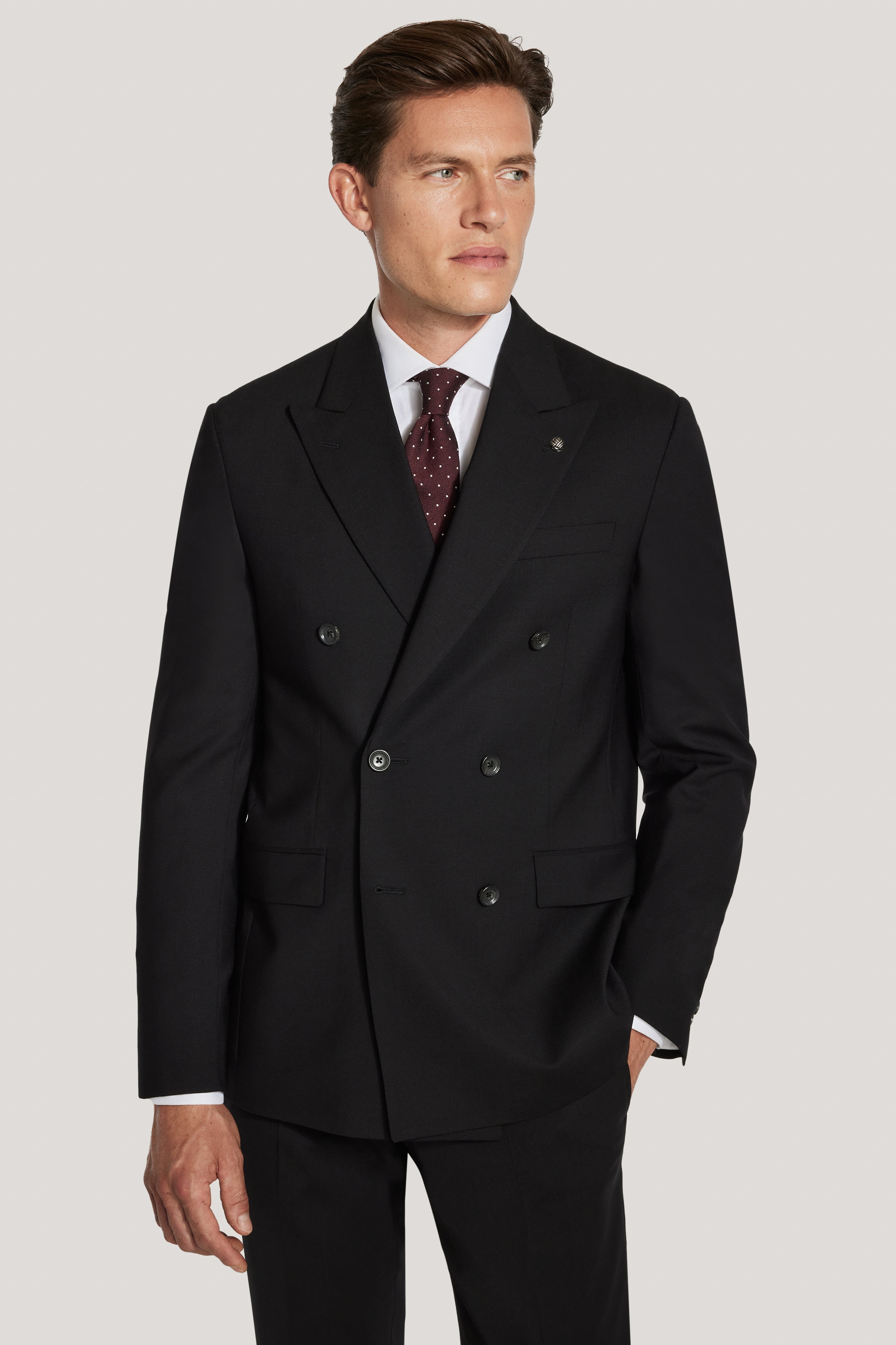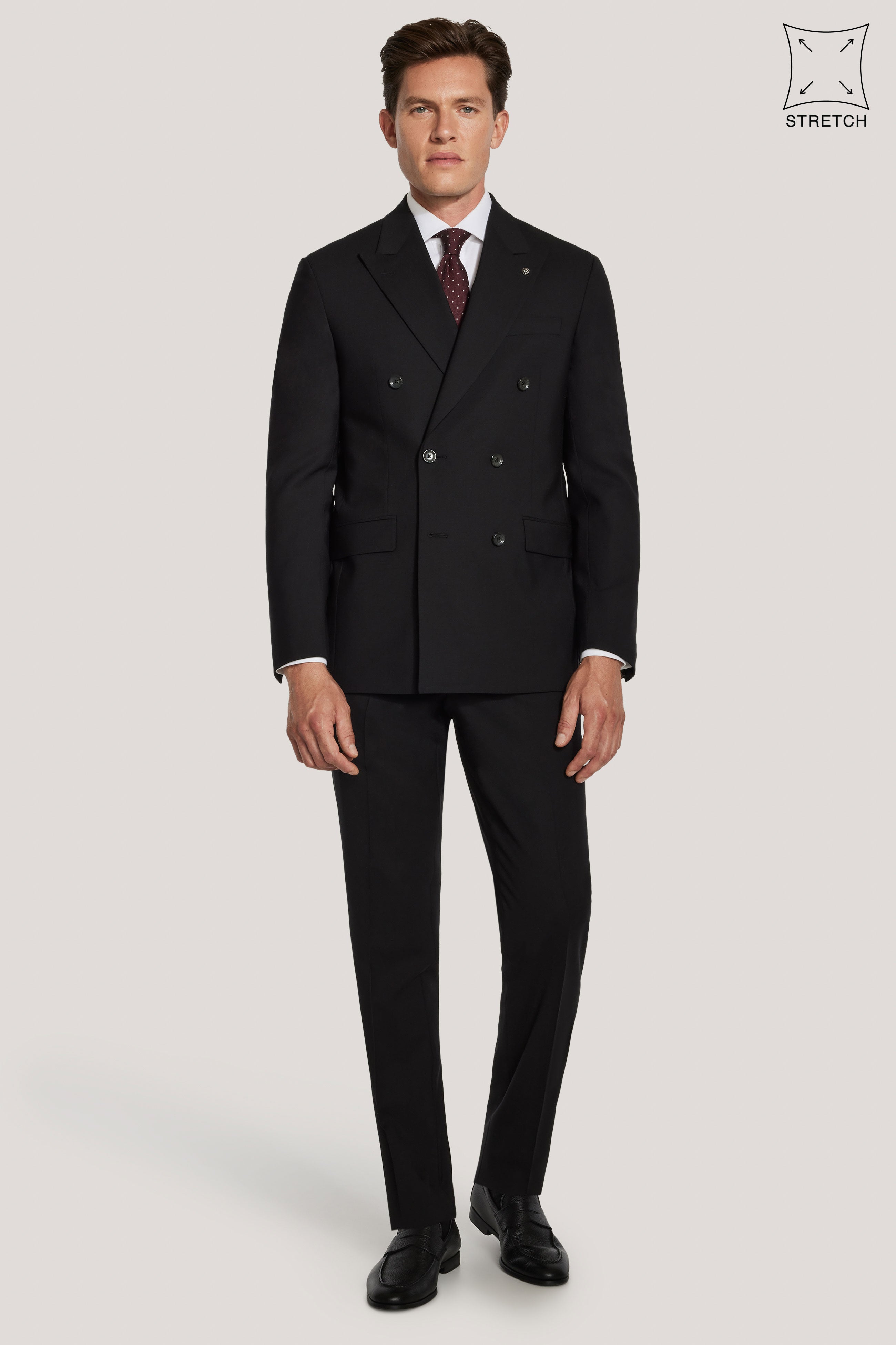 Part of the TEMPO Collection, the Martin black solid suit is designed for modern comfort and effortless style, crafted from a 98% wool and 2% Lycra blend woven as a Bengaline that offers natural stretch and ease of movement. This double-breasted 3 x 2 jacket features a peak lapel, lower flap pockets, an upper welt breast pocket, and interior pockets for a clean, tailored look. With its unconstructed, half-lined design and inserted sleeve with pic-stitching, it delivers a relaxed yet refined silhouette. Ideal for long days or travel, this suit combines elevated tailoring with exceptional comfort.