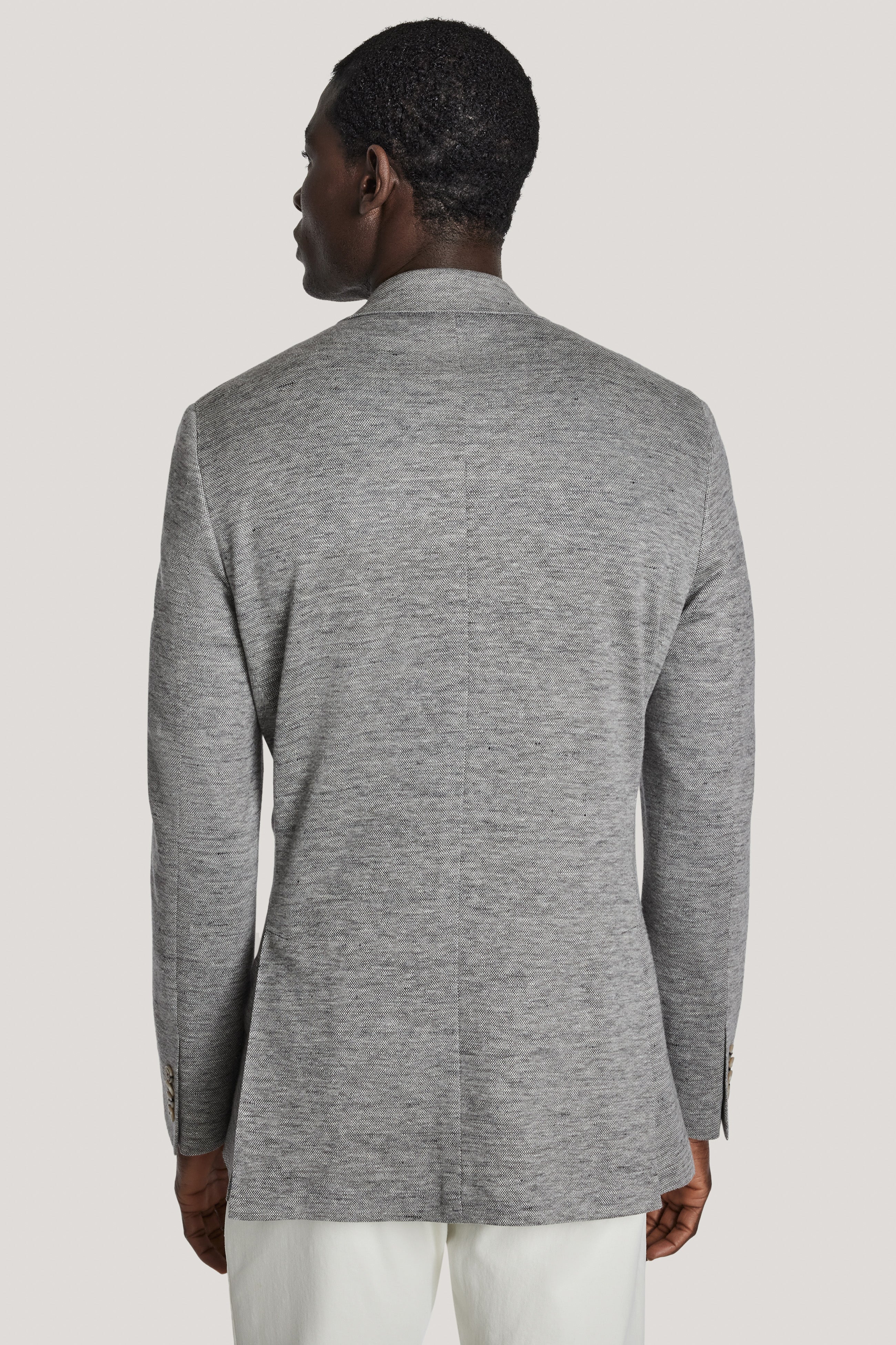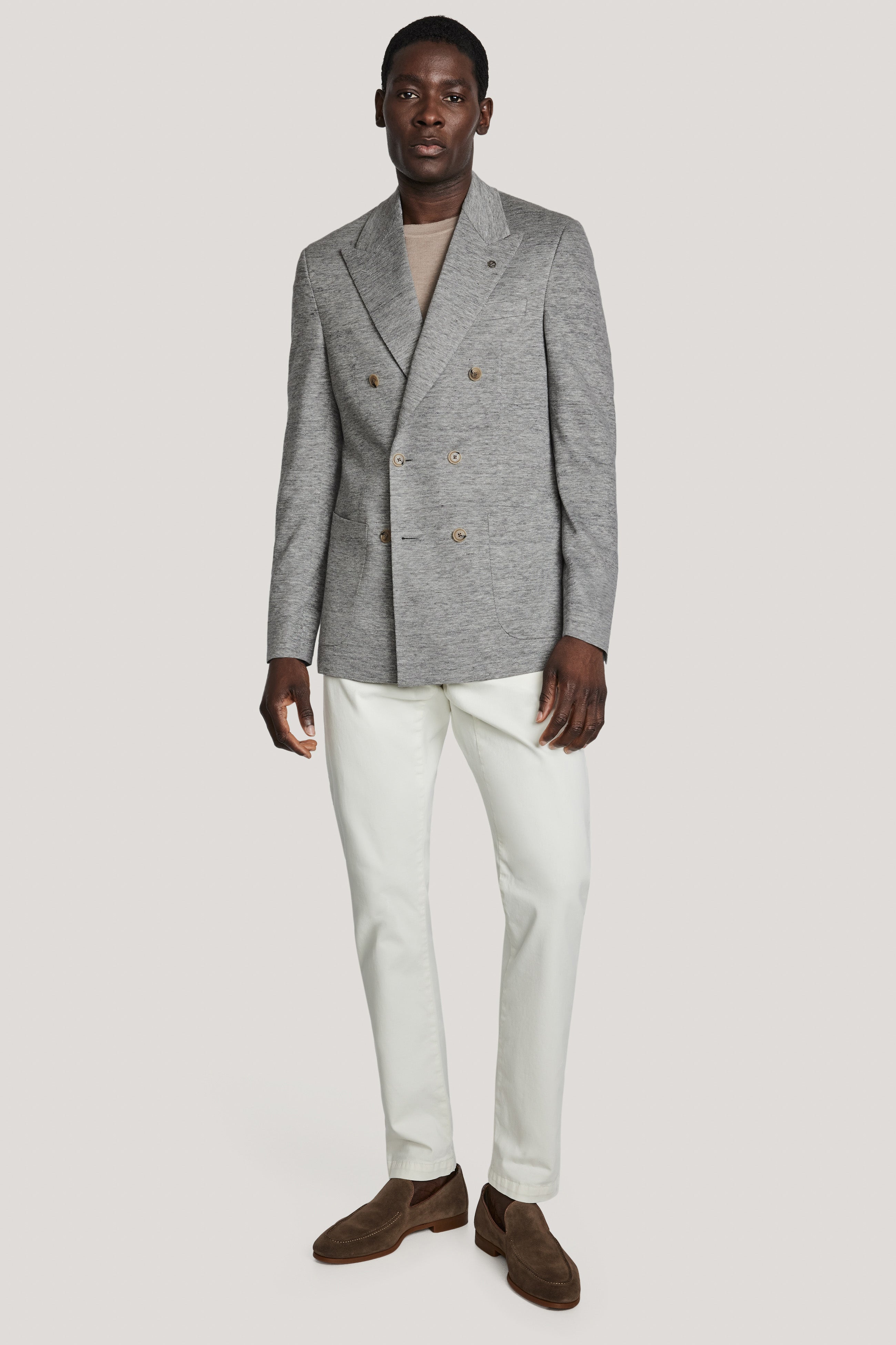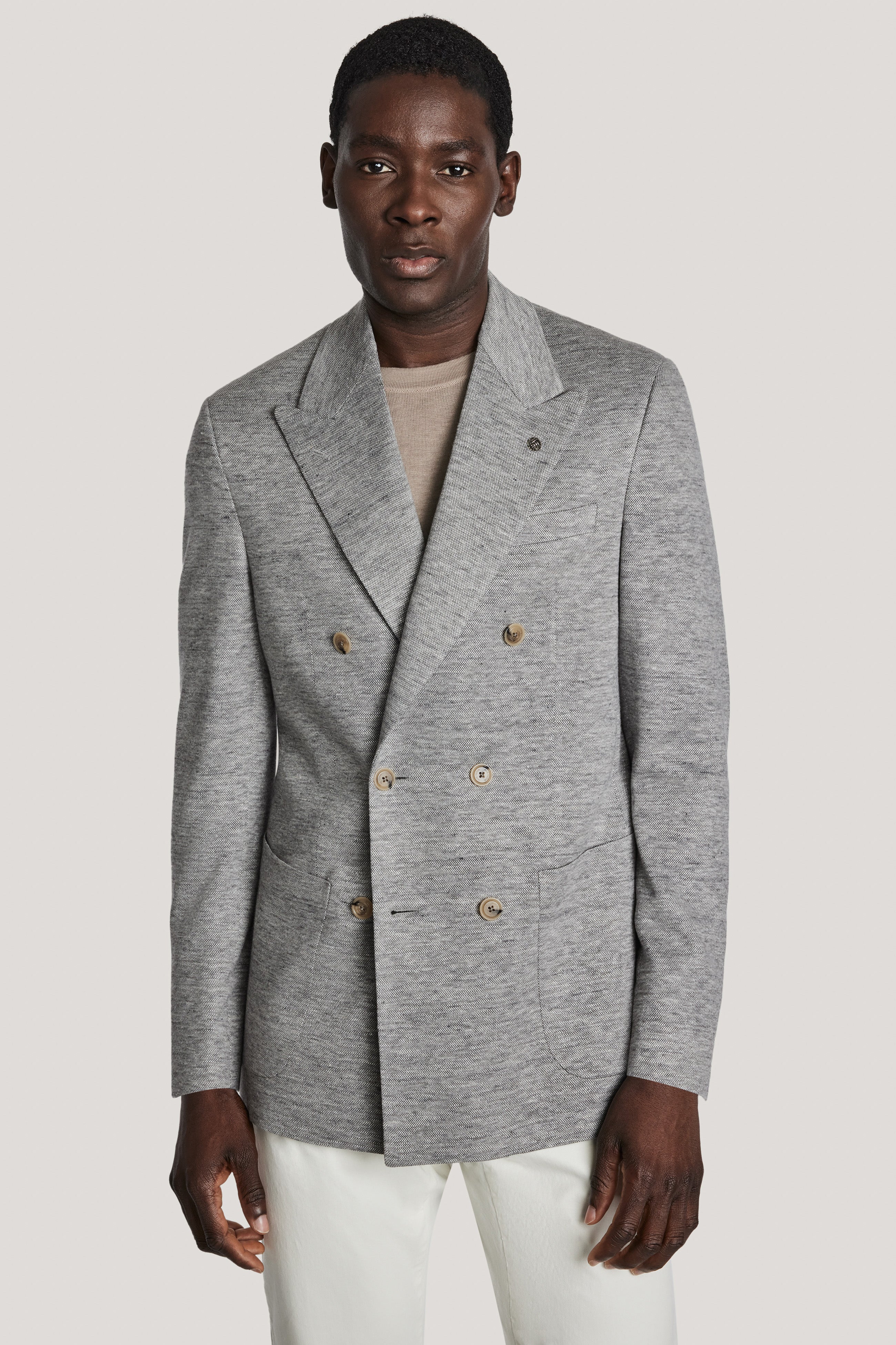 This mid grey COMFORTWEAR™ blazer offers a fresh take on the classic double-breasted silhouette, made from linen, wool, and silk. Part of the COMFORTWEAR™ collection, the Hall model features a 3x2 double-breasted design with lower patch pockets. This blazer offers stretch and comfort while remaining elegant and sophisticated, ideal for Spring layering.
