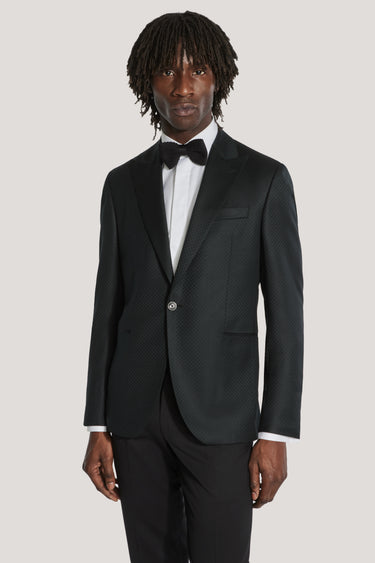 Elevate eveningwear with this sophisticated dark teal dinner jacket, featuring a subtle fishscale-inspired mosaic pattern crafted from a stretch wool blend woven in Italy. Designed with a peak lapel and modern tailored construction, the Erie jacket offers a refined silhouette. Comfortable through the chest and shoulders with a gently tapered waist for a sharp, confident fit.
