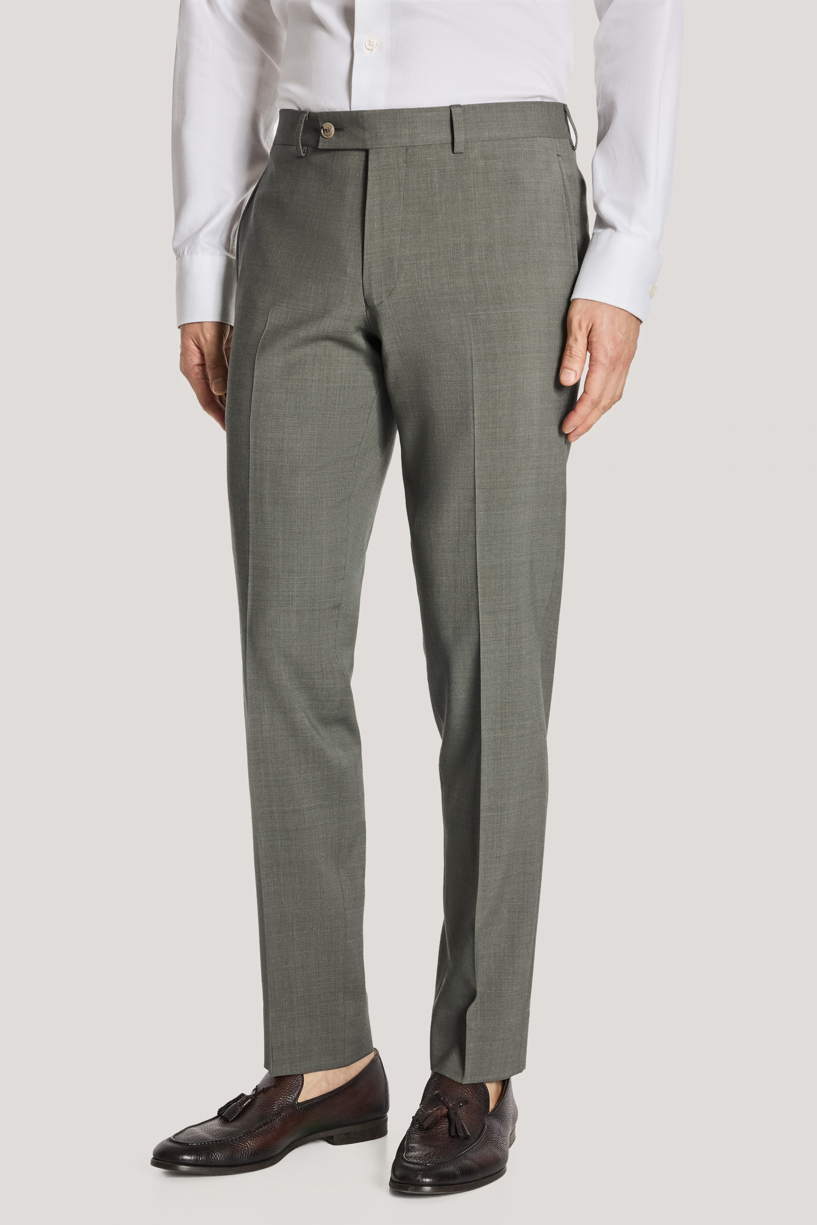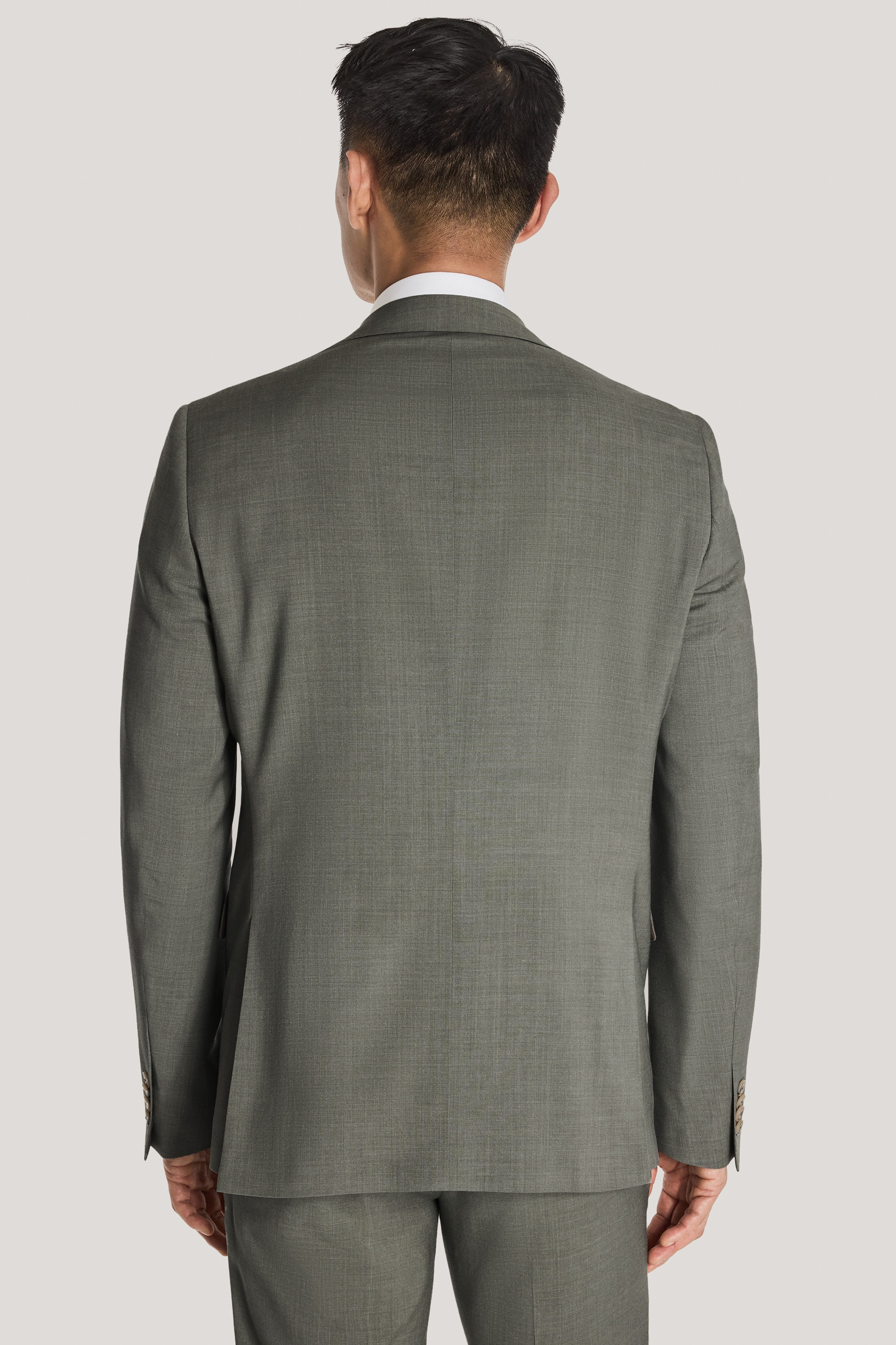 This sage green solid suit, crafted from wool and bamboo for a lightweight and silky handfeel, perfect for the warmer weather. The single breasted, two button design on the Esprit suit includes a notch lapel blazer and lower flap pockets. With soft construction and a fully lined interior, this suit offers timeless style paired with modern performance for any occasion.