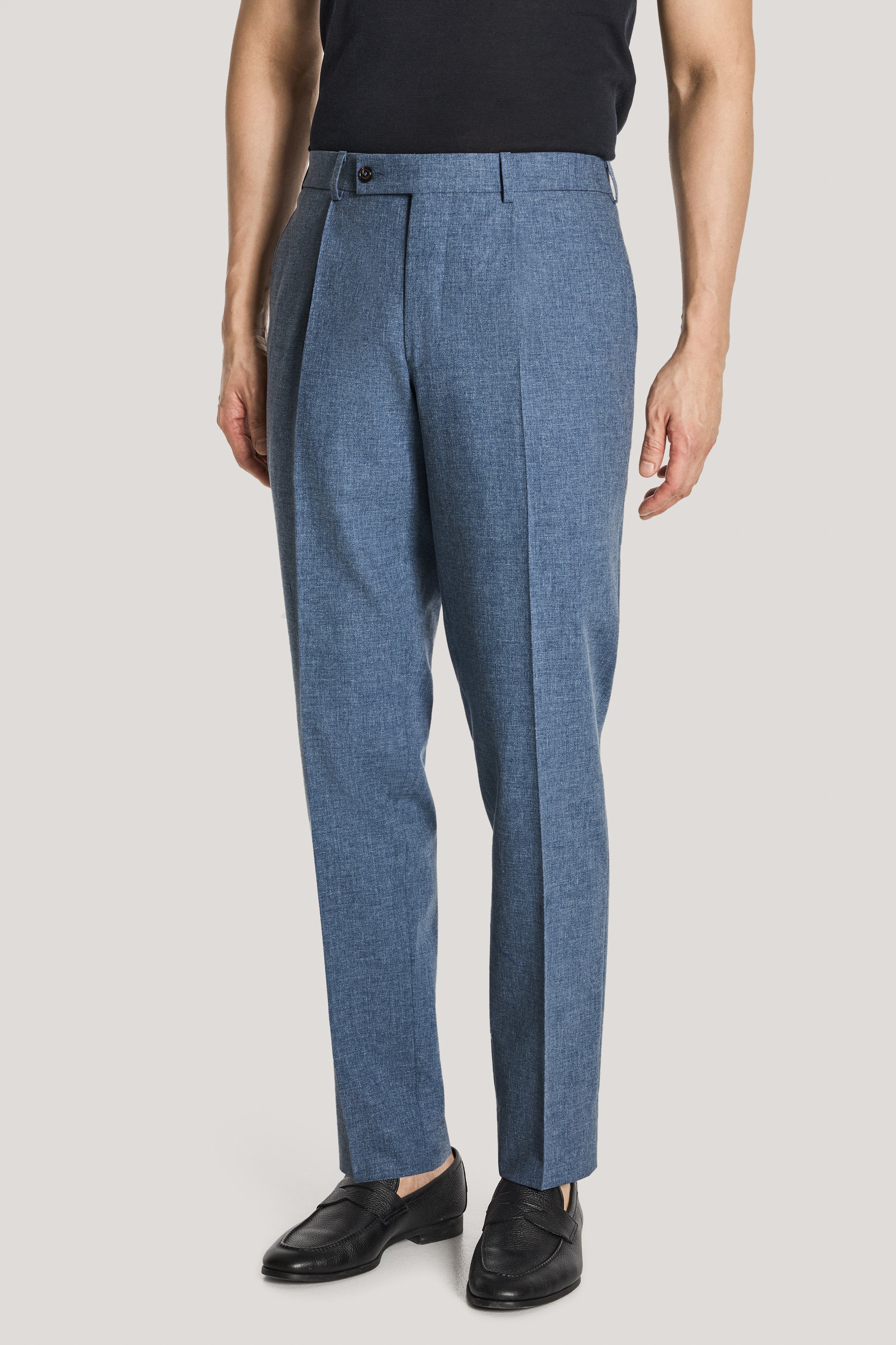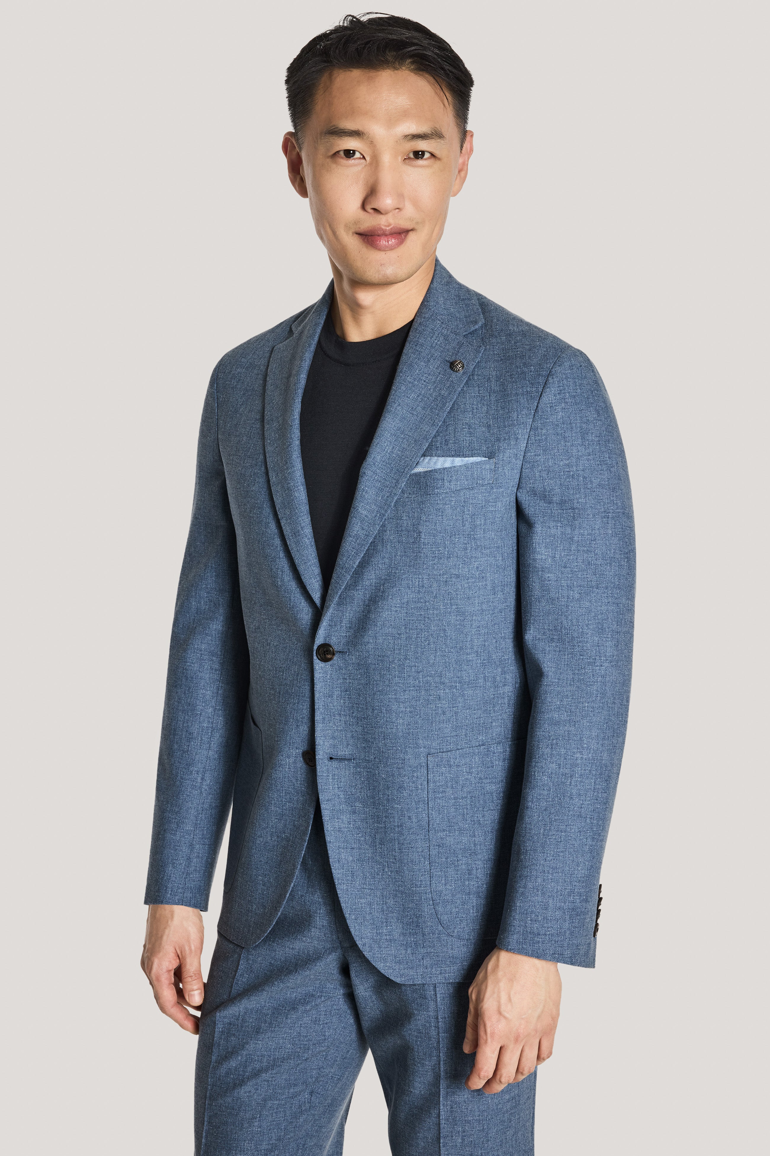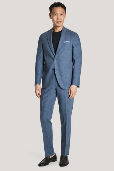 This cream melange suit, crafted from a blend of wool, cotton, and silk, creates a perfect summer suit. The single-breasted, two-button Irving jacket features a notch lapel, patch pockets, and a half-lined butterfly interior for a relaxed fit. Paired with plain front trousers, this suit can be dressed up or down.