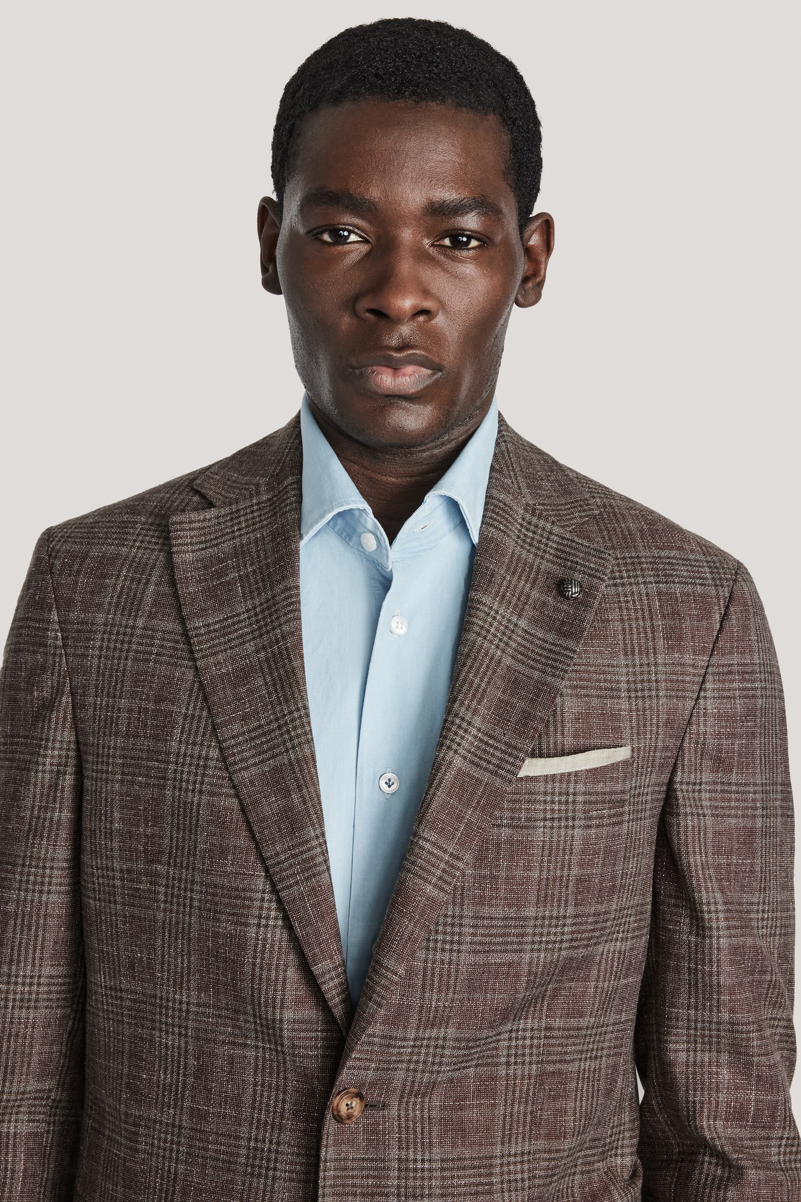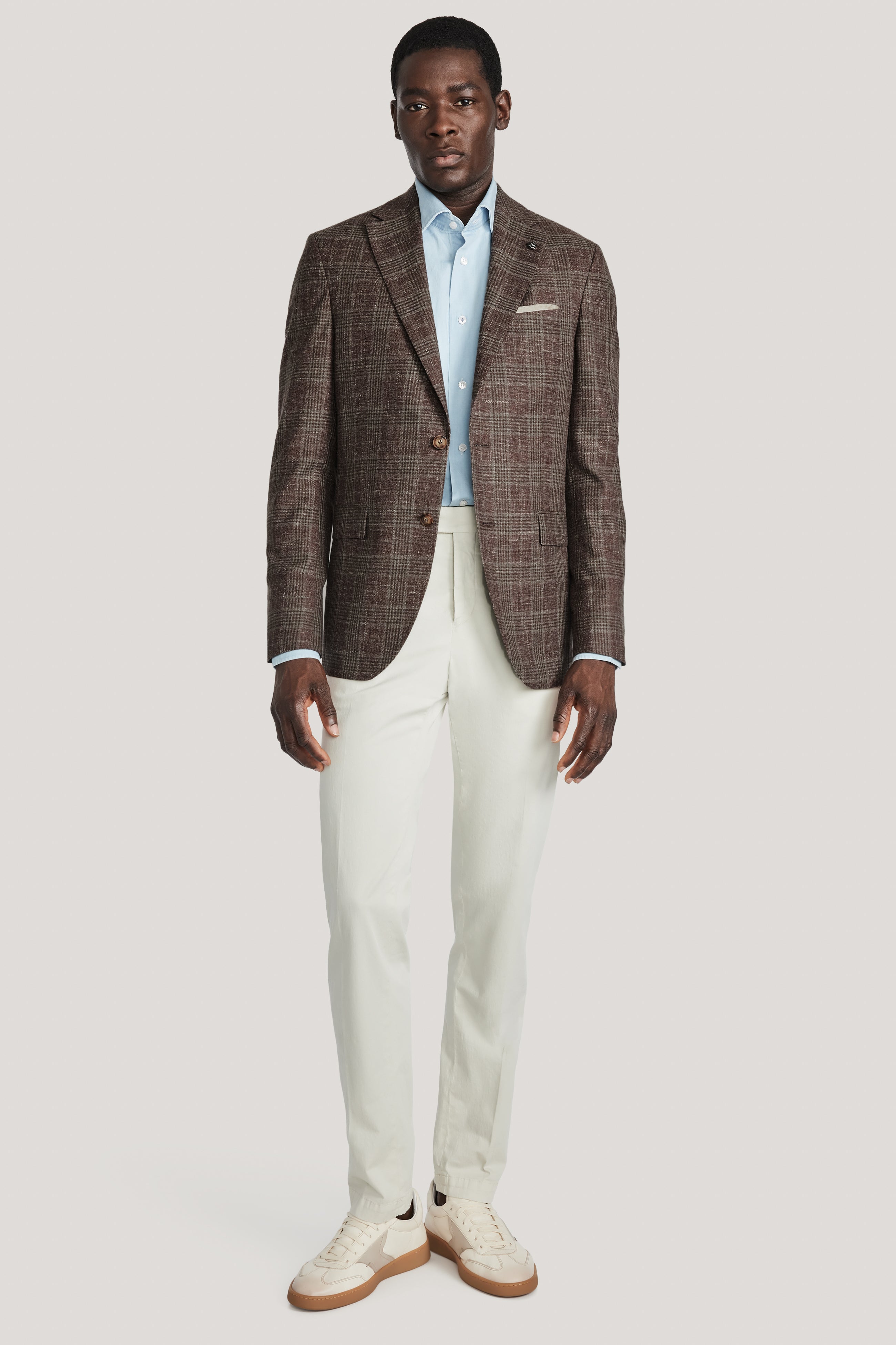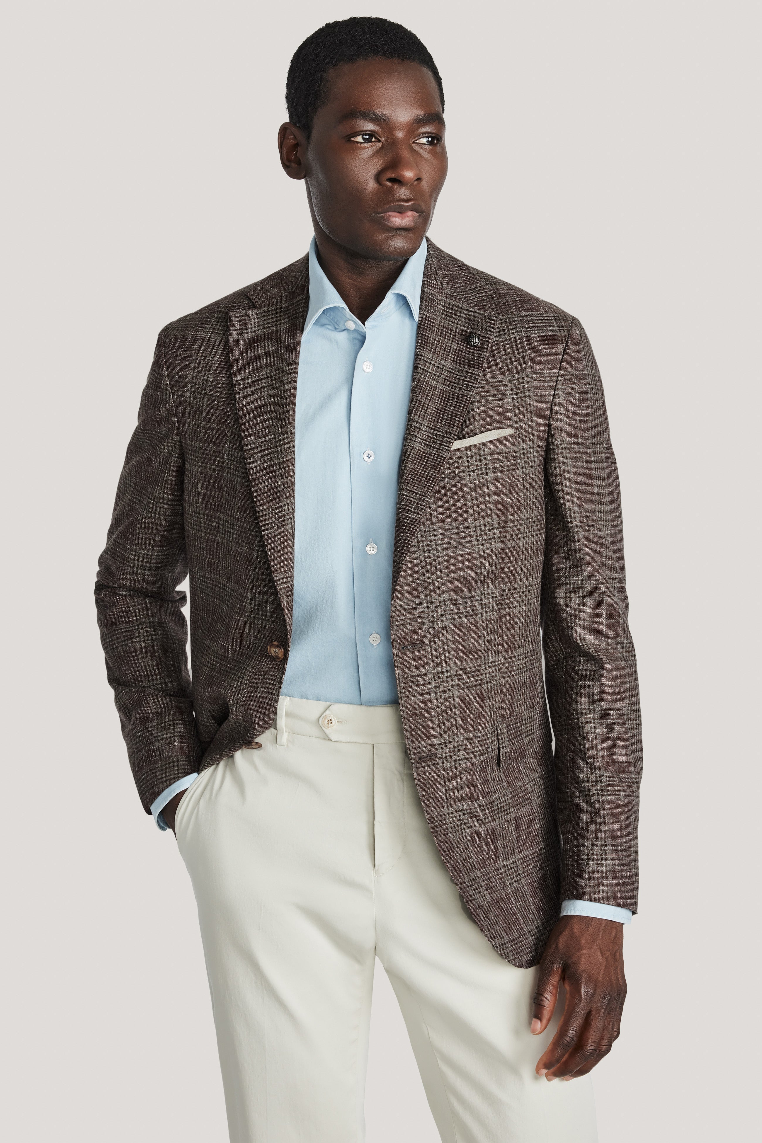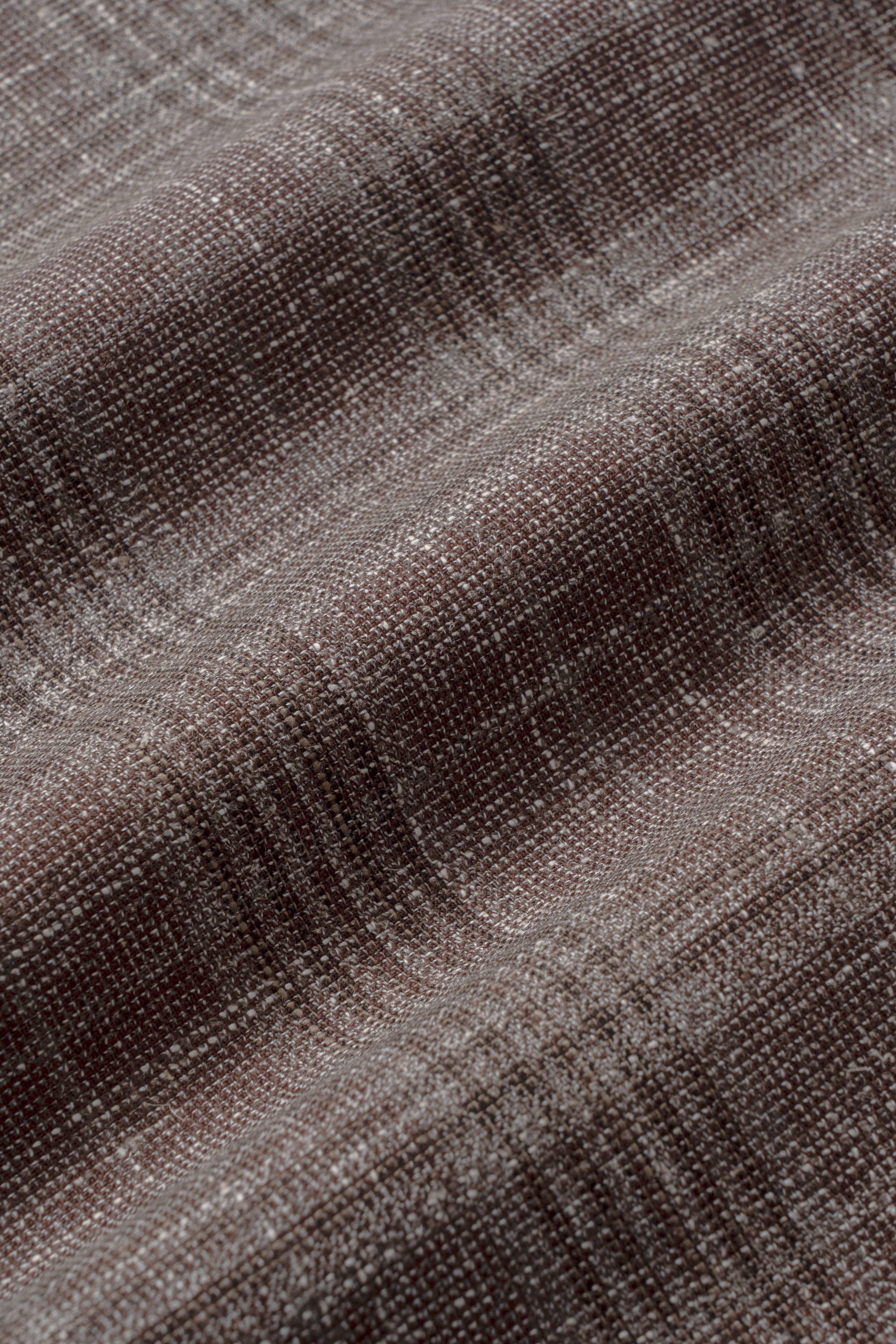 This Midland Brown blazer, featuring a tonal plaid, is crafted from a blend of wool, cotton, and linen. Its single-breasted, two-button design with a notch lapel and flap pockets is unconstructed with a half-lined interior for a comfortable and relaxed fit. The inserted sleeves with pic-stitching add a refined touch to this piece.