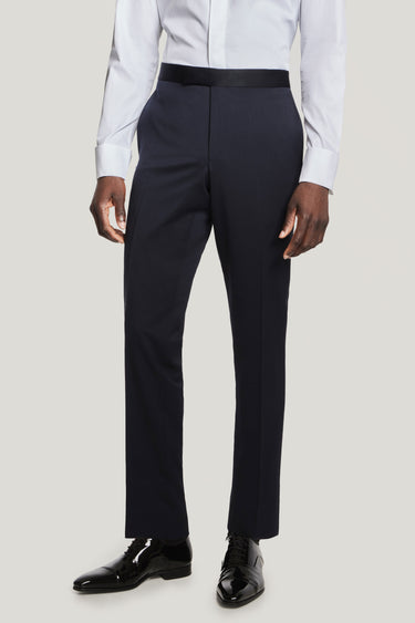 A navy tuxedo is a must for any formal event. The Phoenix tuxedo trouser, crafted from Super 130's wool with a matching navy satin stripe, offers a refined touch. Its contemporary fit features a mid-rise waist and tapered leg for a sleek silhouette.